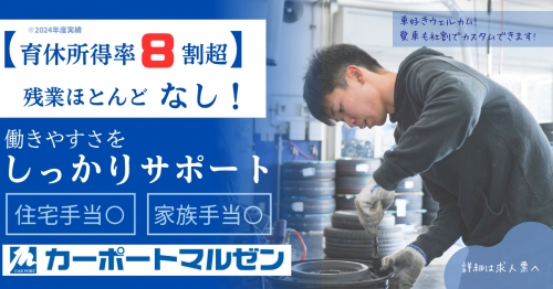 | 仕事の内容 | \\タイーヤマルゼン!タイヤマルゼン!ホイールマルゼン?// <<ホイールマルゼン!!!未経験大歓迎!!!>>【あなたの合いの手募集中】 あの有名CM「タイーヤマルゼン!タイヤマルゼン♪」でおなじみのカーポートマルゼンです。 【マジでチャンスです。】 未経験でも安心してスタートできる研修を用意しており、 クルマを「より安全に」「よりカッコよく」する技術をイチから学べます。 《未経験でも安心!》 「整備士の資格もない」「車イジリ経験ゼロ」でも全然大丈夫。 入社後3ヶ月のOJT研修で、工具の持ち方から作業の流れまでイチから教えます! 《働きやすい環境!》 賞与年2回、昇給1回あり!! モデル年収:年収450万円/20代(入社3年) 残業ほぼなし! → 仕事後も車いじりや趣味の時間に 年間休日125日 → 車だけじゃなくプライベートも楽しめます 産休・育休制度あり 福利厚生:リロクラブ → 映画・ホテルなどお得 資格取得支援制度&資格手当(1〜4万円/月) 《仕事内容》 お客様の愛車をもっと快適に、もっとカッコよく仕上げるお手伝いです。 ・タイヤ・ホイールの交換・取り付け ・サスペンション交換(車高調) ・作業の説明や簡単な接客 ・ピット内の安全管理・清掃 など 《キャリアパス》 希望に合わせたキャリアステップあり スペシャリストライン:技術を極めるピットの仙人コース マネジメントライン:チームをまとめるピットのボスコース 《関西圏以外にも支店展開中!》 大阪/東大阪/枚方/兵庫/埼玉 ※転居を伴う入社をされる方には引っ越し費用の一部を負担いたします! 新しい生活をスタートするなら 今が、【マジでチャンスです。】 この求人を最後まで読んでくれたそこのアナタ!応募をお待ちしています! |